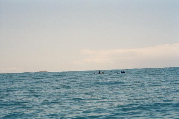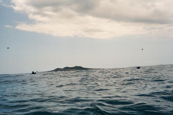 We took our time getting ready for a short paddle to Isla San Jeronimo. This gave me time to dry out my tent. The tide came up over our small patch of beach so Konstantin and Sid launched early and waited offshore while I took another 30 minutes packing my boat. I launched off the rocks in my plastic kayak. Isla San Jeronimo was visible for the entire 9 nautical mile crossing and we had something to aim at. The sky above us was dark and overcast, while the horizon had blue sky. When the wind died down for a few minutes and the water became calm the unusual arrangement of sky colors painted the ocean beautiful colors, as if the sea were made of mercury or painted with oil colors.