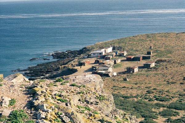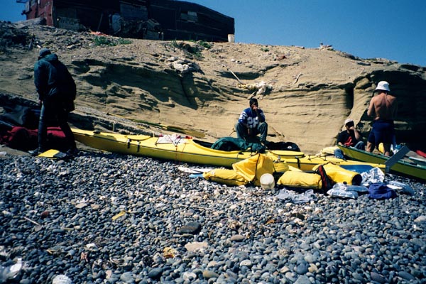 We went around the east side of the island and watched some local fishermen land in the “cove”. They gunned their engine, roared into a narrow channel between two flat topped rocks, slammed into a steep gravel beach, raised the outboard engine to protect the propeller, slid up the berm, teetered at the top, and tipped over to level. High and dry and above the high tide line. A hand powered winch pulled the boat farther up across the top of the berm. Ed Resnic in his book “We Survived Yesterday” had described landing south of the village so we continued. The beaches there were small, steep and had rough waves breaking on them. Only one beach had a semi-protected channel leading to it and Konstantin feared it would not be navigable at low tide in the morning.