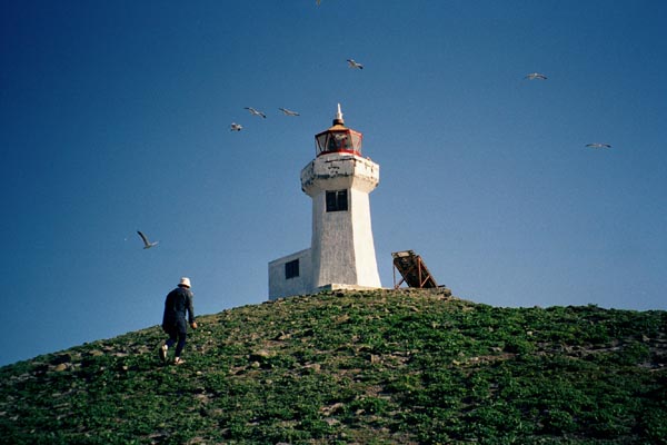 We went for a walk to the ends of the island. Everywhere we went we sank into holes in the sandy soil. We found out later that these are dug by a burrowing bird that spends all day out at sea and comes back to remote islands to sleep underground at night. A statue that I had seen while approaching the island turned out to be a pile of rocks and driftwood. A stone lined trail, the only one of it’s kind on the island, runs from the “statue” to small cave. Farther around the island we stopped at the lighthouse, a solar powered light that stores up sunlight by day and spends it flashing at night.