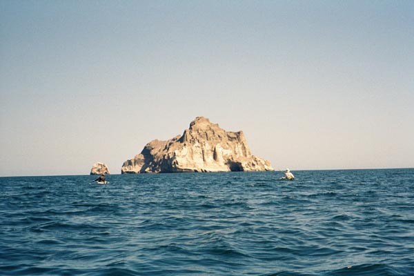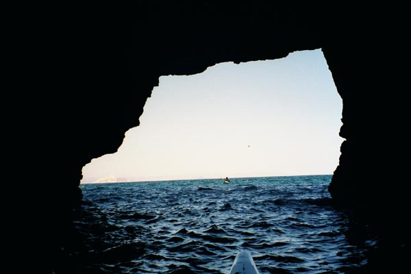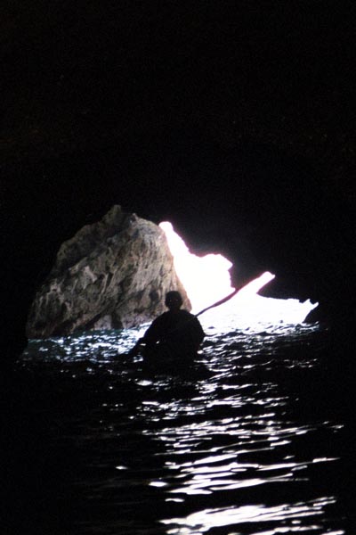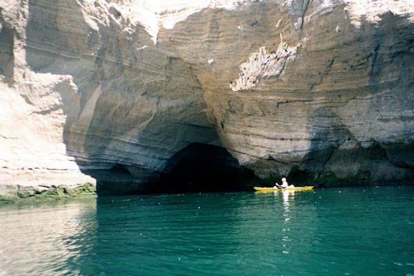 When I got back in my boat the other two guys wanted to turn aside to go around a large rock. This turned out to be Isla Pomo, an island of pumas that crumbles into the sea and floats away. (“Enchanted Rocks” according to our cruising guide). There were several caves in this island, one large with a sandy beach in the end. Sid landed inside here and was the only one of us make landfall on this interesting island. We found two other caves that were deep and narrow. This island has steep sides dropping directly into the water and we only saw one other place where a kayak might land. Both looked like they would be under water at high tide.