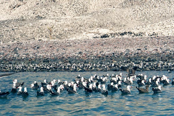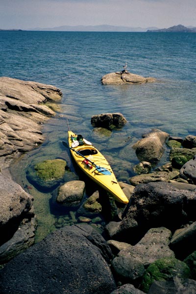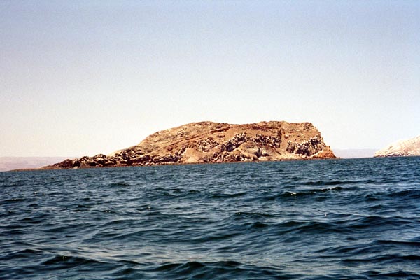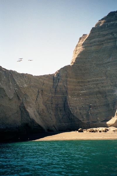 After circumnavigating Isla Pomo, we turned back to Isla San Louis to finish rounding that island. At the north end of this we turned out to sea and headed to the next island. Isla Entrada is made of layers of white and red basalt dropping steeply into the water. Curiously this island did not seem to be covered in bird droppings like all the others. We looked forward to staying somewhere we would not get screamed at by birds everywhere we went. Sid and I landed for a few minutes on the south face of the island, which was too steep for birds to nest on. Also too steep to camp on. As we rounded the corner of the island we discovered that it sloped gently into the sea on the north end and was knee deep in nesting birds, not to mention guano. We had been told by our local friend that there was a landing beach on the west side of the island. We explored the entire west side and found no-place to land. Finally on the north tip of the island we found a small beach. If the weather turned bad, the wind and waves from the north would make this a bad place to be. In addition we were pretty sure that this beach was under water on high tides. We circumnavigated the whole island looking for a better place to camp and found none. So we went back to the small sandy beach.