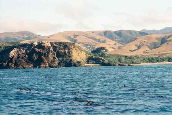 In the morning we were still alive, or we had been crushed by the trees and were in Heaven. We packed up and for once I was ready as fast as Konstantin. We launched and turned to travel close to shore. Partly to try and avoid scaring seals on the offshore rocks and partly to do some fun rock gardening. We were encouraged to move away from shore by some breakers in shallow water and then buy huge waves rising up at Andrew Molera Point. We guessed that it might be from a southern swell but did not go in close to ask some surfers about conditions. South of Andrew Molera we saw a large field of kelp so we stayed outside for a few miles. At Cooper Point we went inside again and went rock gardening through all the rocks offshore of Pfeiffer Beach. At the next point we saw large kelp fields again and went outside. We stayed there for miles, heading straight for the next major point. Partington Point is one of the places we had considered looking for a camping spot where two narrow cracks in the cliff might create protected beaches. The first notch in the cliff had deep water and ended on a beach of large rocks. A park trail led down to it and we saw people there. The second notch in the cliff had shallow water and ended in a cliff so steep that it overhangs the water. Under the overhang was a beach made of rough granite cobble. I could not resist risking scratching my boat to go in for a landing.