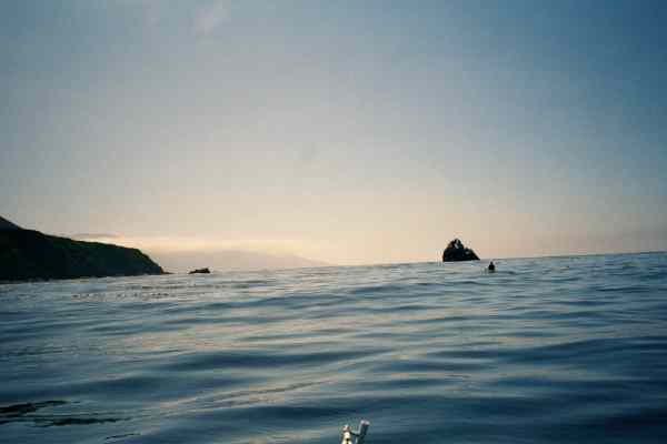 Once outside the kelp this time we went a long distance, all the way to Lopez Point or at least 16 kilometers. The sun was out and the northwest wind never came up. Even without the wind to help us along, we rounded the point before lunch time! We debated going to our planned landing spot, Limekiln Park, or going another 5 kilometers to Mill Creek where a fisherman we talked to had launched a motor boat. Both places were full of people, cars, and official attention that would deny us camping on the beach. Limekiln has a campground but they are always full when I drive by. Even if they had a spot, they would probably make us carry our kayaks way back the valley to a campsite. If we left gear on the beach it might get stolen by someone. And mostly I dreaded having to talk to another ranger about how I got to the beach. Some of them are smart enough to figure out that I cannot have gotten here, or get to anywhere else without CAMPING ON A BEACH that is not a Resource Designated for That Purpose! Since we were early and the weather was fair we decided to skip all that hassle and paddle an extra 12 kilometers to Gorda Point and risk being able to find a camping beach there.