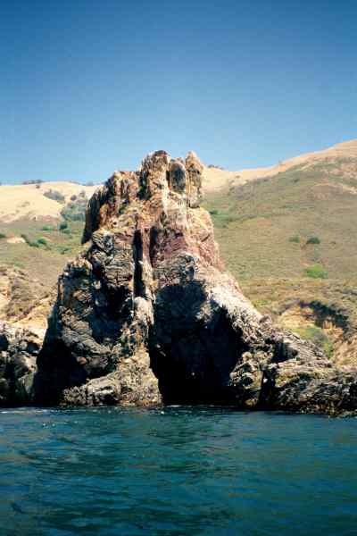 We headed towards the north end of an area marked on the chart as having a bunch of little coves in it. This turned out to be a very interesting place with what looked like black basalt columns sticking up out of the water. These provided some protection for the coves which had white sand. (No sand was called out on the chart). We went rock gardening between the columns and checked out all the beaches. I landed at one small pocket beach with a pile of kelp on it. On my first attempt to land my boat hit the deep shelf of kelp and bounced back into the sea! My second attempt was successful. The water was shallow with a rocky bottom in front of the beach which might make launching at low tide the next morning difficult. So I did a kelp launch (slipping off the kelp into an arriving wave) and we continued looking.