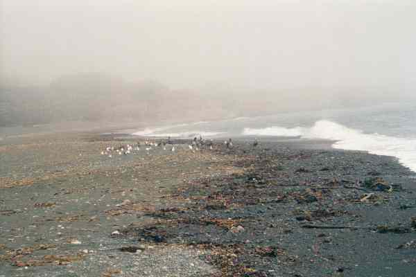 This was the first surf launch of the trip since Half Moon Bay and I was nervous. A large set started to come in and I could have sat it out in the soup zone. But as the waves got bigger they broke farther out. I reasoned that I could keep paddling out to meet them and they would all break in front of me until the set was over. By then I’d be past the point where smaller waves broke and I’d be free from the surf. This might have worked if I hadn’t been over eager and paddled too fast. I paddled out into the place where a large wave broke on me! My loaded boat speared the wave without slowing down and I paddled the rest of the way out without incident.