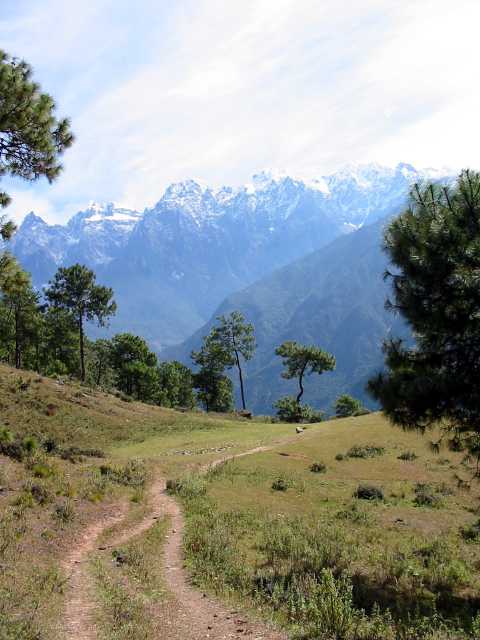 Our guide (we never wanted a guide) dropped his pack and continued to offer "I help you", finally saying "No money, I help you". On our map he indicated that he knew the way to link us back with the main trail, part way up the steepest part. We let him lead us out of town, a maze of crisscrossing trails. He lead us past some spectacular viewpoints where we could see the Dragon Jade Snow Mountain. This mountain is almost 5600 meters tall and always covered with snow. It is the highest mountain that either Joe or I have ever seen with our own eyes.