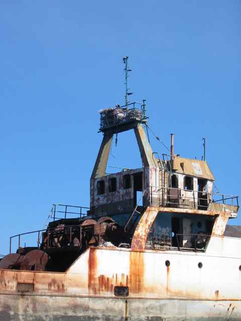 We paddled close to the rocky shoreline as we headed north and saw more sea lions hauled out. Around one point we caught sight of a large fishing boat that turned out to be a wreck. The boat looks like it was calmly driven ashore and could back out and return to work at any moment. But it has been here long enough for ospreys to build nests in the crows nest. (Nobody told them that spot was reserved for a different species of bird). At low tide water is squirting out of small holes rusted in the hull, which means somehow the water gets in at high tide.