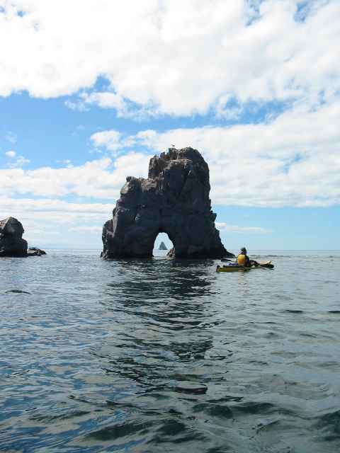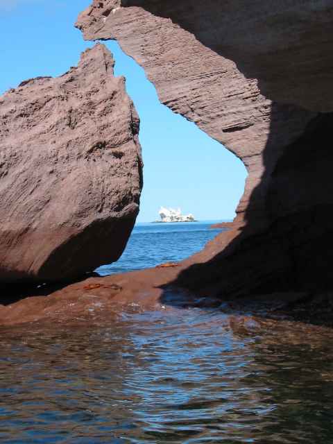 We stopped to photograph our first cave on the island. Before this point the shore had been gravely, from here on it was rocky and varied, with small caves and coves to poke into. There is a white spire of rock offshore, Roca Vela, and many rocks close to shore. One of these had an arch in it. Just large enough to fit my kayak through. Next we rounded the end of the west shore and turned into the channel between the main island and Isla Mejia. A current slowed us down but swell rose up a little and helped us forward. A peninsula that was supposed to add 2 kilometers to our day helped us with a shortcut across a spit that was under water at high tide.