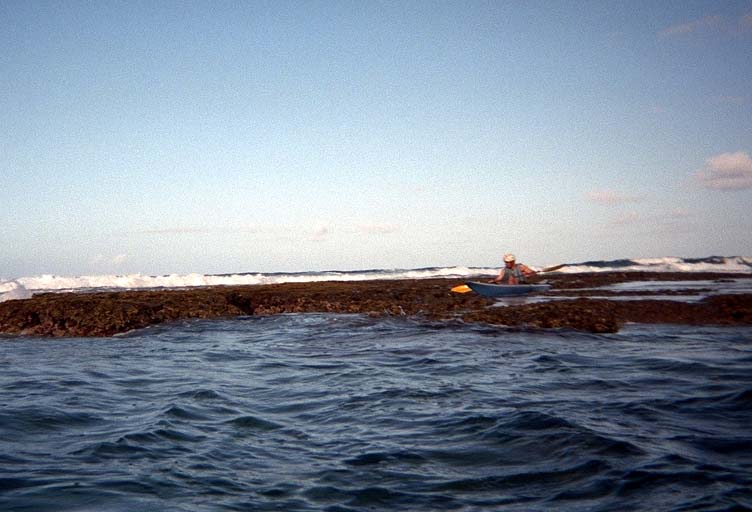 Paddling behind the reef was interesting. The waves rose up and broke over the outer edge of the reef, then lost almost all their energy before they got inside. After a while we ran into water that was too shallow for the boats. Pulling the boats behind us we started detecting a strong current going the same direction we were. Jamie said this current would lead us to the next rip current and our exit from the reef. This worked great and we soon found a place where we could exit out to sea. But the reef was still a new experience so we turned back in and went behind it again. Jamie stopped half way in and sat there for a long time, reveling in being close to the breaking waves. When he came in he suggested I try it. Soon after I got into the channel, a large set of waves came it. I braced into one and was surfed sideways all the way behind the reef again!