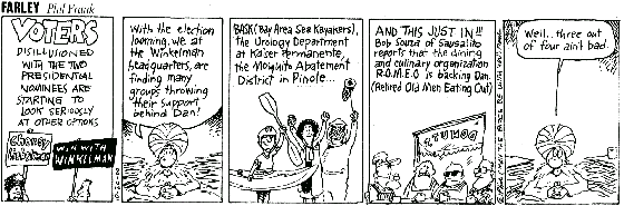 I announced our support for Dan Winkelman at the next BASK meeting and sent a press announcement to Phil Frank's email address at the San Francisco Chronicle. A few weeks later the following comic appeared in the paper: