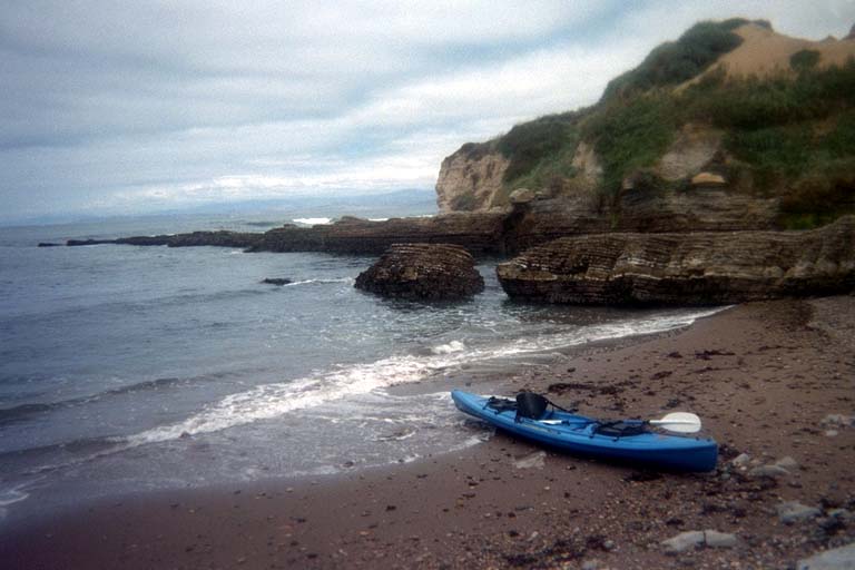 I arrived before my sister and launched to explore the north side of the cove. I was unwilling to risk the narrow channels on the north side of the beach and headed north around the stony reef. This section of shore was still reasonably well protected from the southern swell. I was able to go behind the stony reef in a few places where there were channels of deeper water. One of these channels was wide enough and deep enough to go all the way into the cliffs were there was a small sandy beach. I paddled into this channel and caught a wave to surf me onto the sandy beach. The water in the channel was shallow and had a rocky bottom, conditions I have found good for kayak surfing before. I paddled back and forth here and got some pretty good rides. Then I paddled back to the cove to have lunch with my sister and her kids.