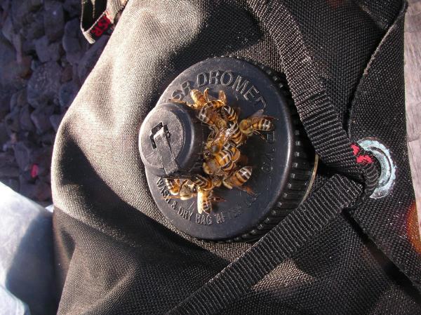 Honey bees loved Kate DesLaurier's leaky watter bottle caps