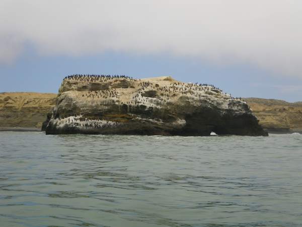 Bird covered island with small arch in it