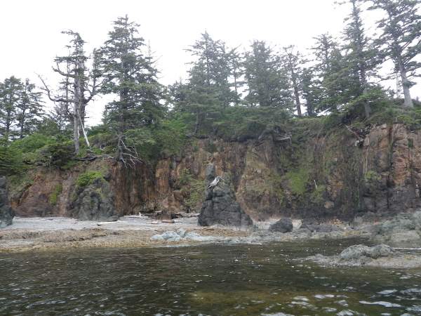 Trees to the edge of the bluff and rocks standing on the beaches.