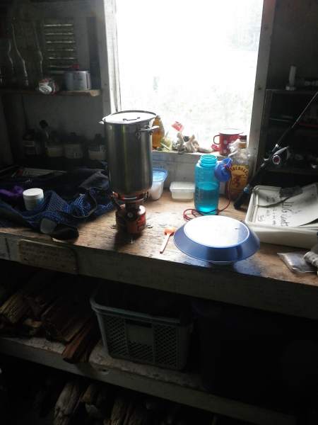 I cooked my dinner in the cabin at Lowrie Beach, out of the rain