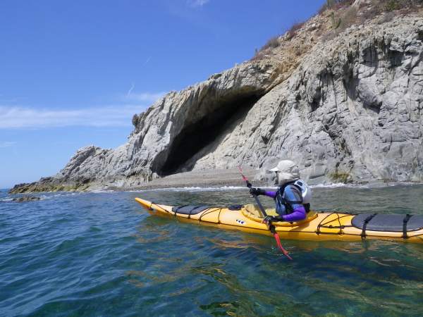 Andrea Wolf paddling north along the shore of Isla Ceralvo