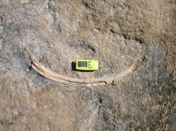 A fossil bone in the sandstone cliff on Isla San Jose