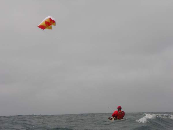 Brian Schulz kite sailing his skin-on-frame kayak