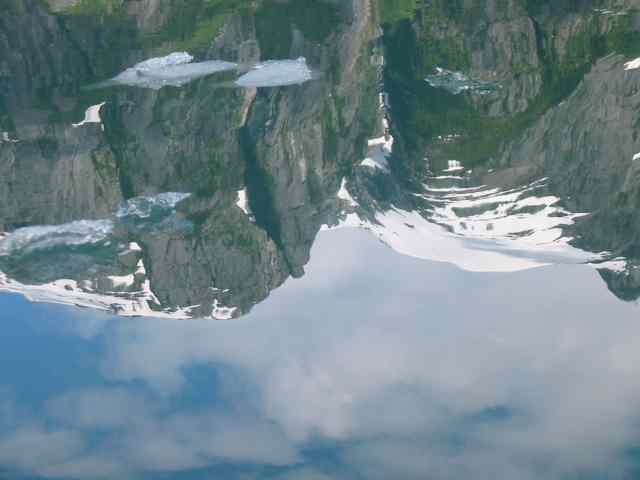 Mountains reflected around burgy bits in LeConte Bay