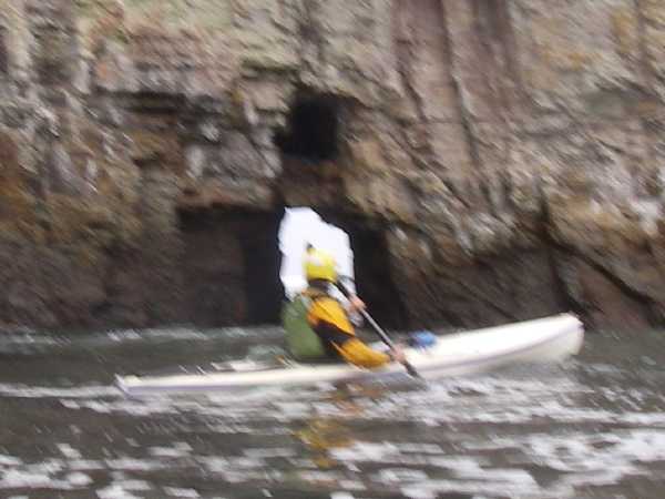 The intrepid kayaker in front of the small arch in Sea Lion Rock
