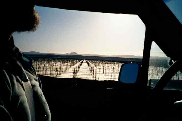 Stakes in fields out the truck window