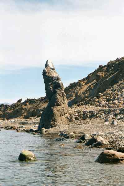 A phallic rock spire on the beach.