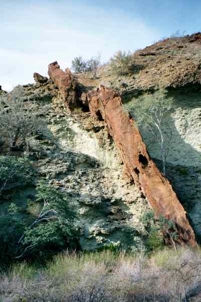 Red dike sticking out of green cliff at Cueva Del Diablo