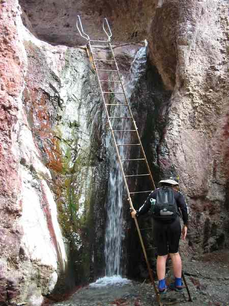 Kate DesLauriers on ladder at Arazona Hotsprings.