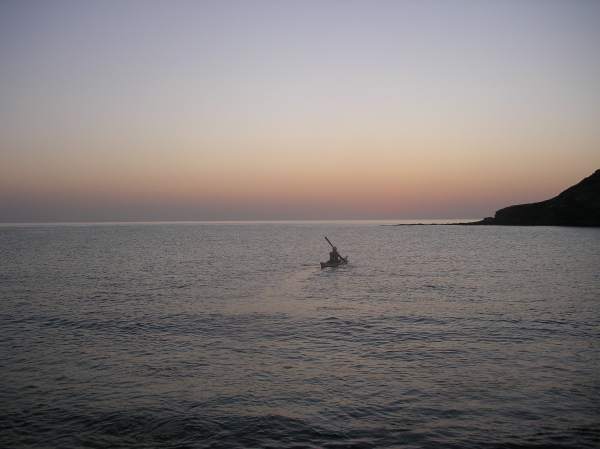 The Intrepid Kayaker paddling solo from Isla Monserrat into the sunrise