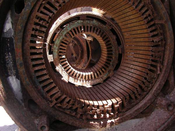 Old generator housings in the power house at the ghost town on Isla Carmen