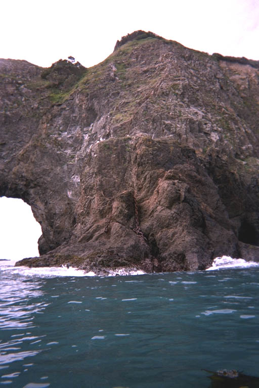 The telephone pole and chains on the entrance to Warf Rock in Greenwood Cove.
