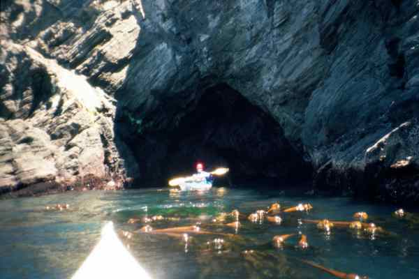Kayaker entering a cave south of Iversen Landing