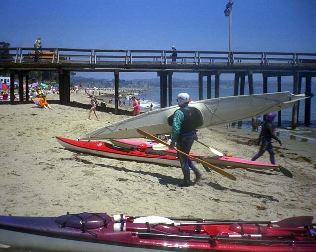 Paul MacIntire with a baidarka at the Santa Cruz Beach Pier