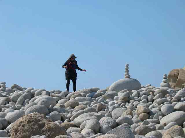 The smooth granite cobble is stacked into 100\'s of stone ducks