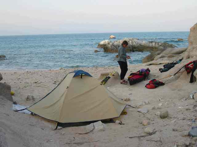 Our tent in the mouth of a sandy arroyo, safe from the high tide.