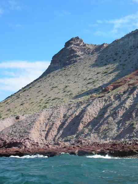 Steep rocky shoreline of the west side of Isla Tiburon