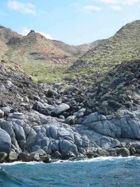Steep rocky shoreline of the west side of Isla Tiburon
