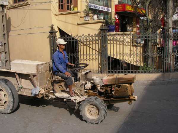 Russian tractor hauling supplies in Pottery Village