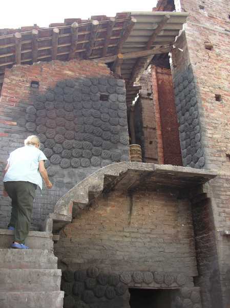 Maryly Snow climbing to second floor of kiln
