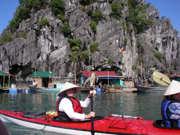 Kate DesLauriers paddling past a floating village on Ile Du Brandon