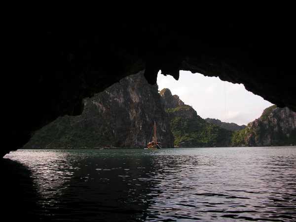 The support boat viewed through a large arch