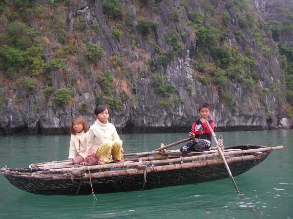 Children rowing a bamboo basket boat to school