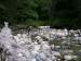 A river flows through the boulders of the beach