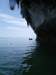 The limestone hangs out over the water on Pang Nga Bay, Thailand