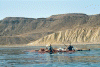 Kayaks in front of yellow hills