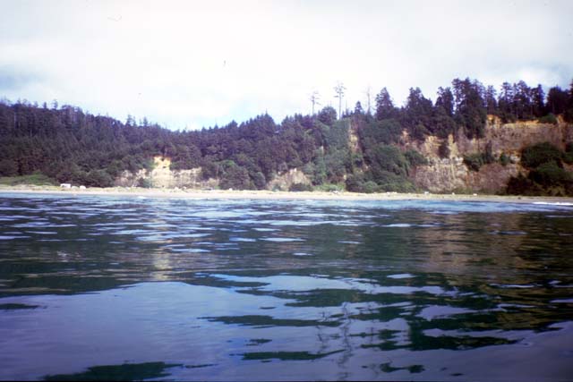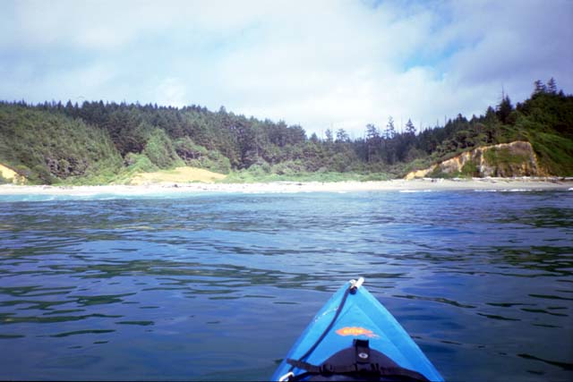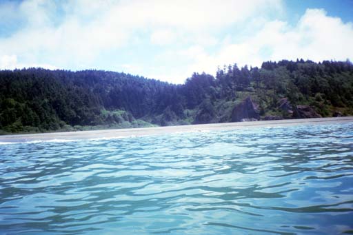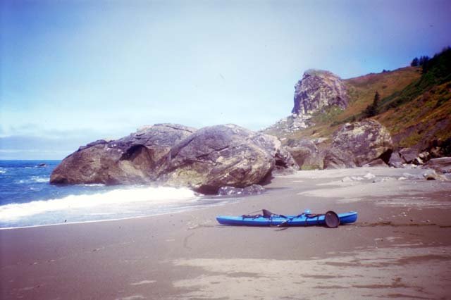 My charts show a rocky point south of Johnson's Creek but the large sandy Gold Bluff Beach has grown to extend around the point. The beach was very steep and the waves dumped directly onto the sand. I found a place between two rocks where I thought I might land on my return trop tomorrow. But I continued on into Humbolt County.