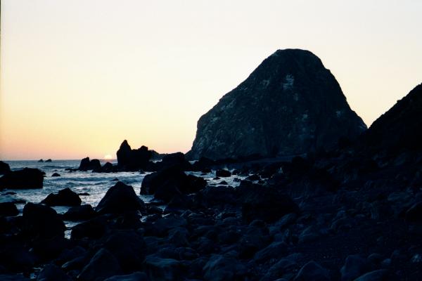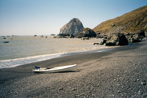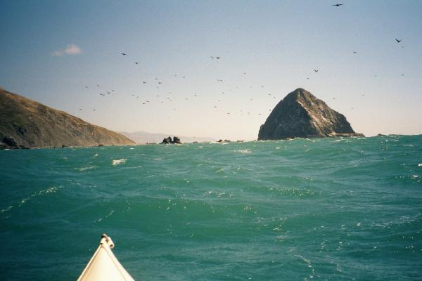 Behind False Cape there is a beach where I considered camping so I landed to look around. The wind was picking up and was miserable everywhere except up a steep narrow valley that didn't have any good flat tent spots. I had talked to Sid Taylor the night before by phone and he recommended going around Cape Mendocino and camping at the protected beach there. Despite the wind I proceeded. (The weather radio had forecast small craft advisory for today and tomorrow). The wind continued to impair control of the boat unless I paddled straight away from it. So I went far out to set myself up for a straight shot downwind behind Sugarloaf Island off Cape Mendocino. I had forgoten to ask Sid if he went inside or outside the island when he was in this neighborhood. The waves were large heading in but they broke over submerged rocks and helped me plot my course. As I got closer to the gap the waves got smaller and choppier as the water turned the angry milky green color.