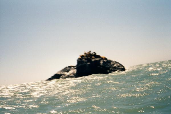 Directly behind the island the water was doing a strange thing (which usually means trouble). There was this zipper of breaking water running from the island half way back to shore. The waves seemed to break straight up into the air. Was it just a wave wrapping around the island? Or a shallow spit behind the island? Turns out it was the latter, a spit covered with small jagged rocks. I steered past the end of the spit and planned on weaving my way through a closely spaced rock garden. To my left was a rocky beach covered with a HUGE colony of California sea lions. I had visions of trying to land a damaged boat there and being driven back into the water by angry bull sea lions.