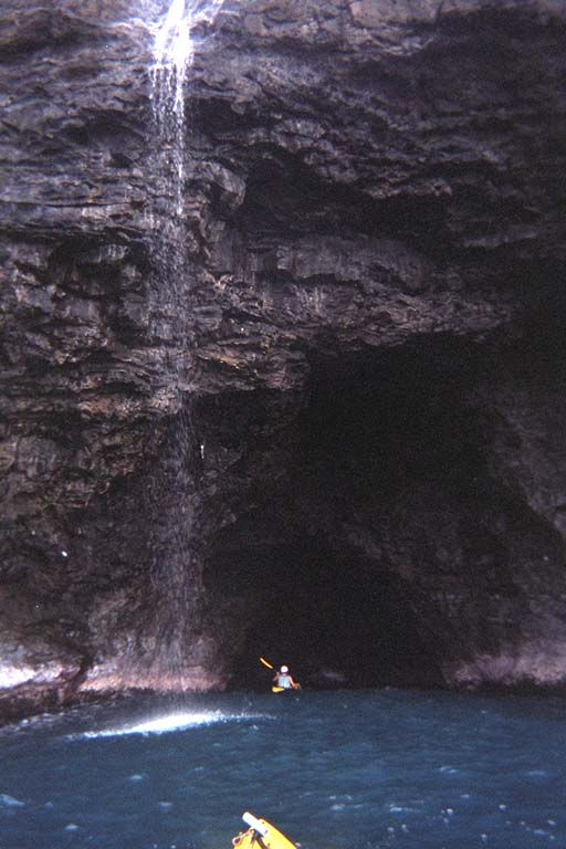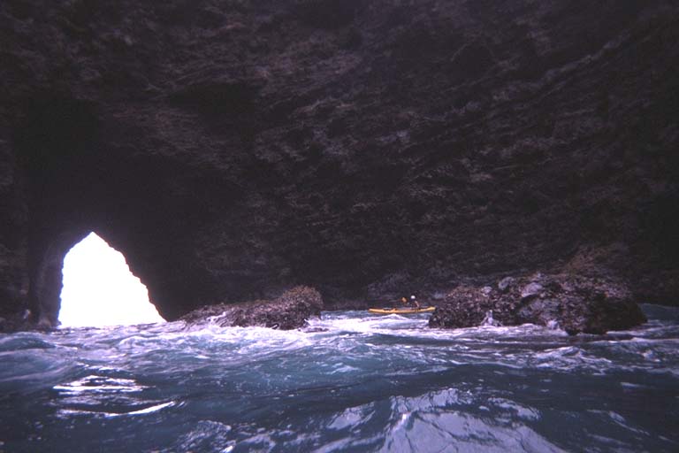 We launched from Kee Beach and had no problems getting through the surf and heading south. The waves did not look any higher than the other day when I was here by myself. Jamie said that the waves were just high enough to make the caves interesting but not too dangerous. He skipped most of the same caves that I skipped on my trip. We both went into the cave in the west end of the big dent. We both went into the "Worlds Second Largest Sea Cave" together but saw no tour boats in there this day. Jamie went in the Front Door of the Double Door Cave and continued down the long tunnel towards the back. I followed him so this time I ended up going front to back instead of the other way around as when I went through here twice by myself.