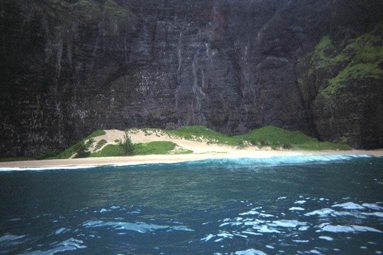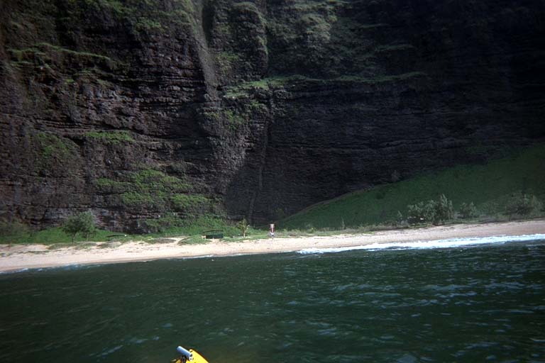 We had to stop at the Hanelai Bay office of Kayak Kauai to swap our leaky kayaks for better ones. When we got there, we found a message from Mike Malone. He had finally heard the weather report and was a little concerned about us. He recommended that we NOT land at Kalalau because we would not be able to launch in the morning. He recommended going to Milolii Beach and camping there. He recommended paddling back north to Kee Beach the next morning instead of continuing on to Polihale Beach. Polihale is reputed to have murderous surf this time of year, even on a mild day. These recommendations were the safe thing to do, the prudent thing to do, the conservative thing to do. They also violated the regulations and our permit.